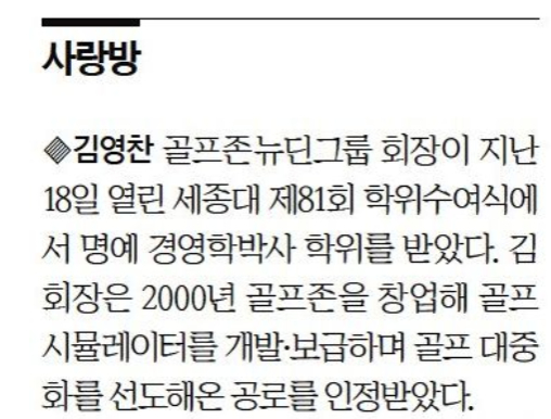 28 | 딜사이트 | 골프존뉴딘그룹 김영찬 회장, 세종대학교 명예 경영학박사 학위 영예 |