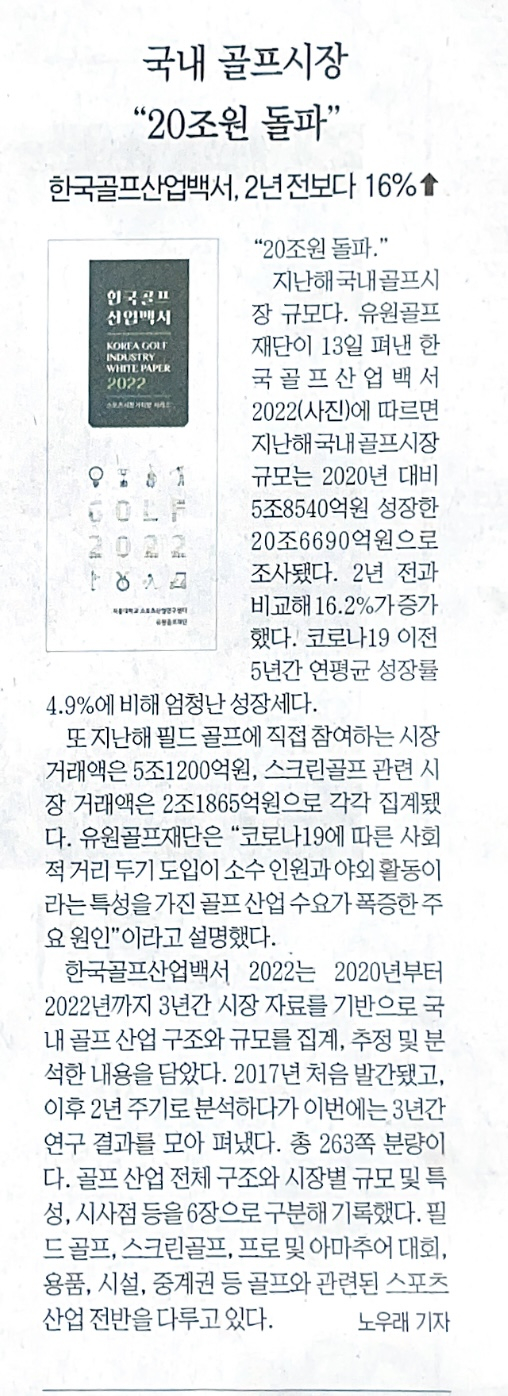 42뉴스인사이드유원골프재단, ‘한국 골프산업백서 2022’ 발간..국내 골프시장 규모 20조 6,690억 원