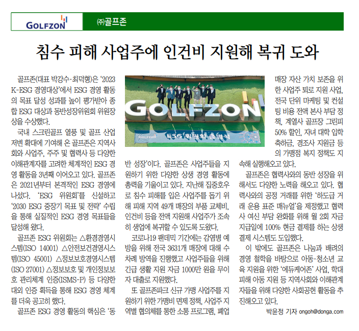 안녕하십니까 골프존이 지난 25일 ‘2023 K-ESG 경영대상’ 시상식에서 대상 및 동반성장위원회 위원장상을 수상 했습니다. 골프존은 국내 스크린골프 열풍 및