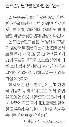 골프존뉴딘그룹 전국 아동·청소년 대상 ‘온라인 진로 콘서트’ 참여 소식이 다수 매체에 보도되었습니다.