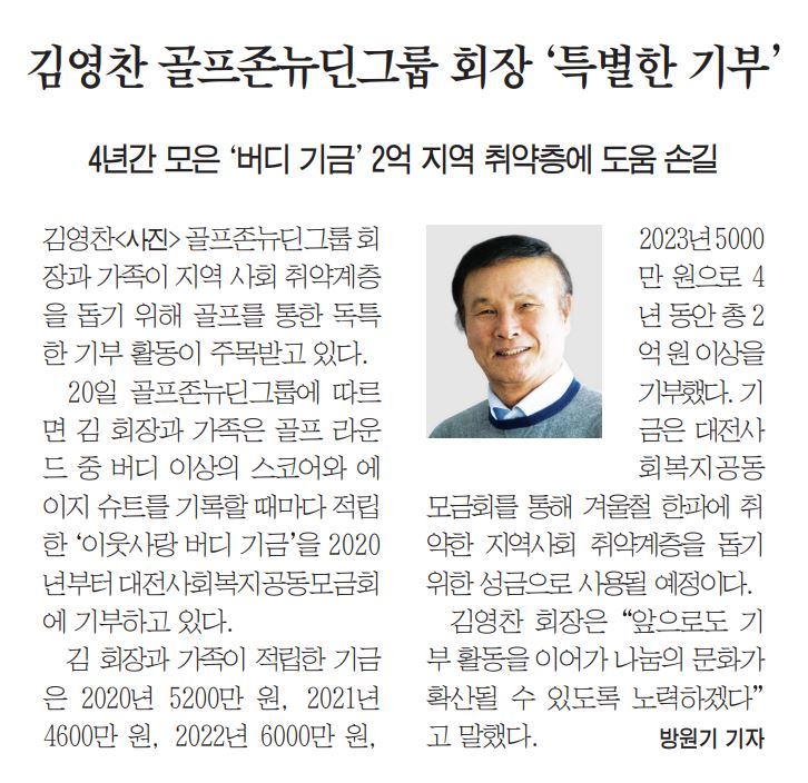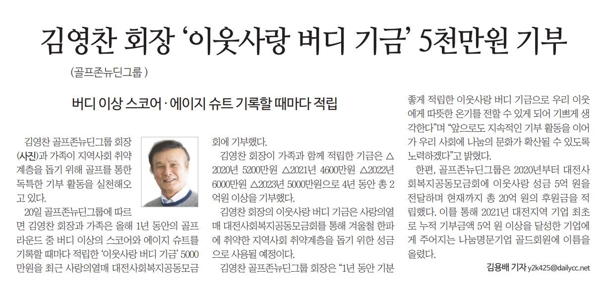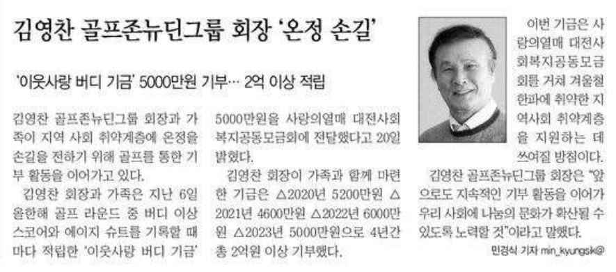골프존뉴딘그룹 김영찬 회장님께서 올해 이웃사랑 버디 기금 5천만원을 기부한 소식이 다수 매체에 보도되었습니다.