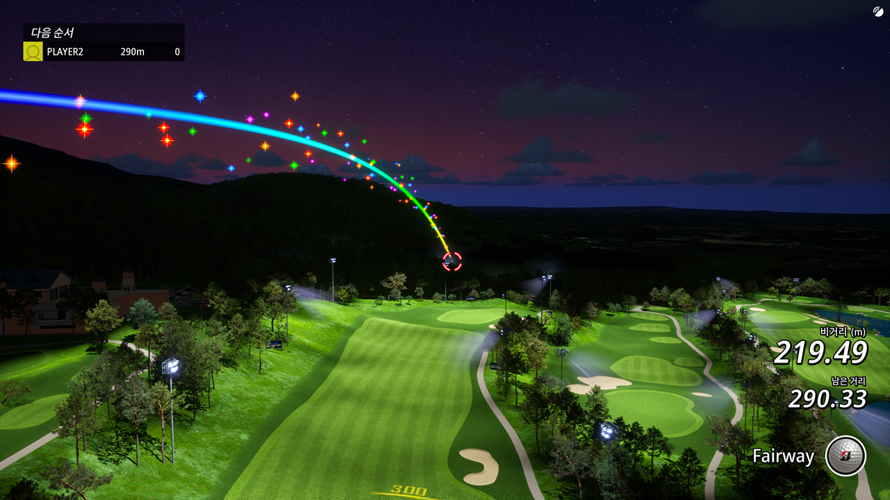 사진1. 골프존이 2024년 투비전NX 업그레이드를 진행했다고 밝혔다. 사진은 투비전NX 야간라운드 시 볼꼬리가 연출되는 화면.