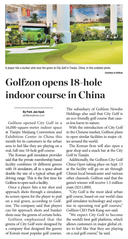 9 | 스포츠조선 | 도심형 친환경 골프장의 미래 스크린→진짜 그린의 절묘한 콜라보, 골프존, 시티골프 신사업 본격화…中 천진서 첫선[골프소식] | 온라인 | |