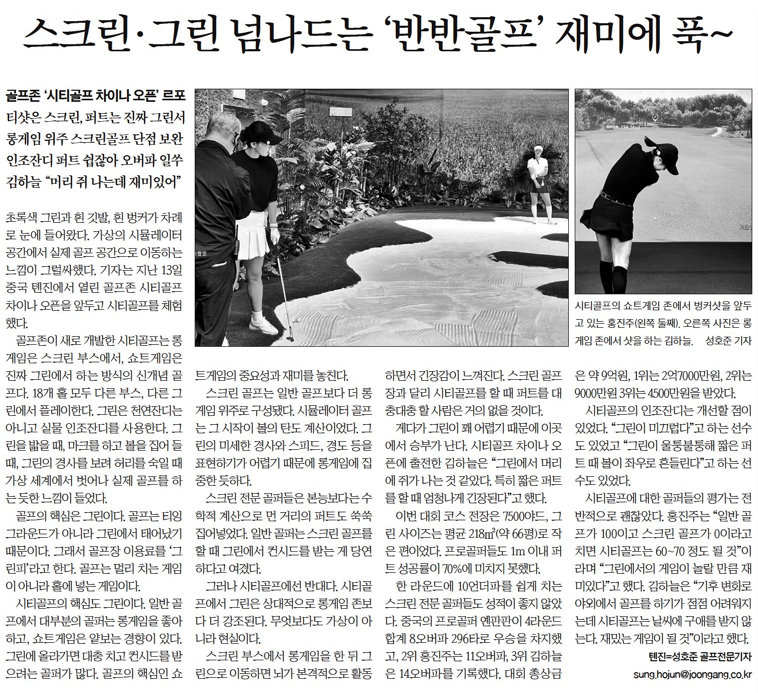 골프존, ‘2024 골프존 시티골프 차이나 오픈’ 중국 옌판판 우승..한국 홍진주 2위, 김하늘 3위 기록 -9월 13~15일 중국 천진 소재 도심형 골프장 시티골프에서 ‘2024 골프존 시티골프 차이나 오픈’ 개최, 총상금 9억원 규모로 골프존 차이나 주최, 중국골프협회 주관 -최종 합계 8오버파 296타로 중국의 옌판판 선수 우승, 3타 차이로 한국의 홍진주 프로 2위, 김하늘 프로 3위로 대회 마쳐 -중국 SINA, MIGU 채널서 대회 생중계 및 많은 관심 받아, 향후 시티골프 활용한 대회 등 새로운 골프 경험 제공에 앞장 24.09.19