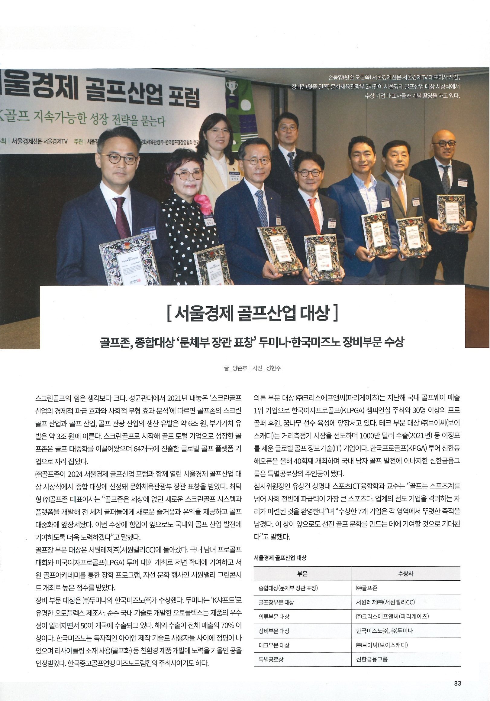 2024 대한민국 골프산업 대상 수상 | 1 | 서울경제 | 지면/온라인 | 8면 | |